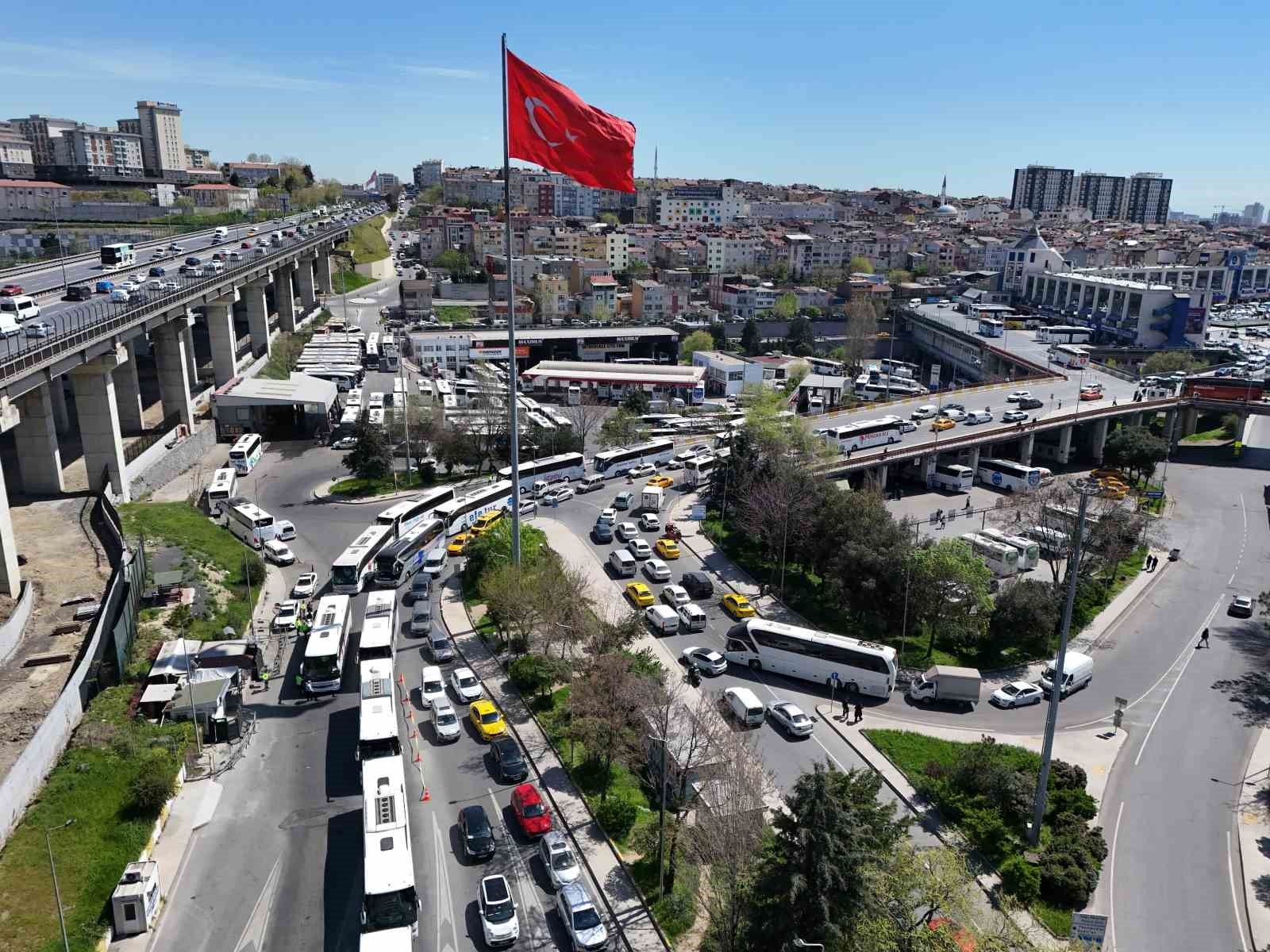 Ramazan Bayramı'nda 9 günlük tatili şehir dışında geçirmek isteyen vatandaşlar 15 Temmuz Demokrasi Otogarı'nda yoğunluk oluştururken trafik ekipleri denetim gerçekleştirdi. Otogar çıkışında oluşan otobüs kuyruğu ise havadan görüntülendi.