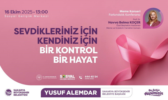 Sakarya Büyükşehir Belediyesi ve İl Sağlık Müdürlüğü'nün iş birliği ile 16 Ekim Perşembe günü "Sevdikleriniz İçin, Kendiniz İçin: Bir Kontrol Bir Hayat" adlı meme kanseri farkındalık konferansı düzenlenecek. Prof. Dr. Havva Belma Koçer konuşmacı olarak katılacağı program saat 13.00'da SGM'de gerçekleştirilecek.
