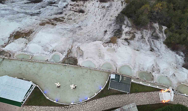 Bolu'da "Küçük Pamukkale" olarak bilinen ve doğal güzelliğiyle hayran bırakan Akkaya Travertenleri, kış aylarında sessizliğe büründü.Kent merkezine yaklaşık 10 kilometre uzaklıkta, Mudurnu kara yolu üzerindeki Çepni köyü mevkiinde yer alan travertenler, doğal yapısıyla Denizli'deki Pamukkale'yi andırıyor. Yaz döneminde yerli ve yabancı turistlerin uğrak noktası olan bölge, kış mevsimi ve soğuk havaların etkisiyle en sakin günlerini geçiriyor.Yeşil çam ormanlarının arasındaki beyaz dokusuyla güzel manzaralar oluşturan travertenler, dron ile havadan görüntülendi.