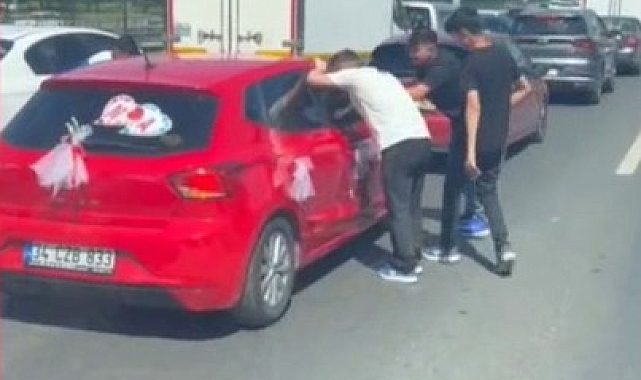 TEM Otoyolu üzerinde yoğun trafik nedeniyle ilerlemekte zorlanan gelin arabası, gençlerin dikkatini çekti. Bu sırada araçtan inen gençler, gelin arabasına doğru koşarak zarf almak için damadın yanına gitti. Gelin arabasından aldıkları zarfları heyecanla açan gençler, içinden çıkan 10 lirayı görünce oldukça şaşırdılar. Bu anlar, cep telefonu kamerasıyla kaydedildi.