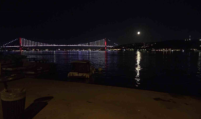 İstanbul'da gece saatlerinde gökyüzünde beliren dolunayın deniz yüzeyine yansımasıyla oluşan yakamoz, 15 Temmuz Şehitler Köprüsü'nün ışıklarıyla birleşerek seyirlik görüntüler oluşturdu.İstanbul Boğazı, gece saatlerinde gökyüzündeki dolunay ve deniz üzerindeki yakamozun birleştiği anlara sahne oldu. 15 Temmuz Şehitler Köprüsü'nün aydınlatmasıyla birleşen ay ışığı, su yüzeyinde parıltılı bir şerit oluşturarak kentin gece silüetine eşlik etti. Boğaz hattındaki sakinlik ve kıyı şeridinde demirli bulunan teknelerle birlikte oluşan manzara, İstanbul'un gece görüntüsünü yansıttı. Ortaya çıkan kartpostallık görüntüler, Kuleli sahilinden kaydedildi.