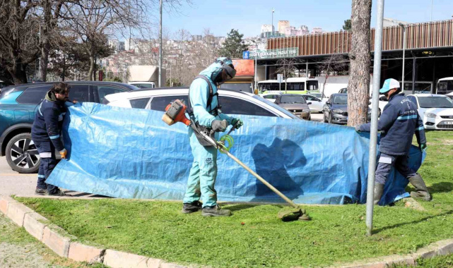 Kocaeli'de yeşil alan bakımlarında araçlar brandalarla korunuyor