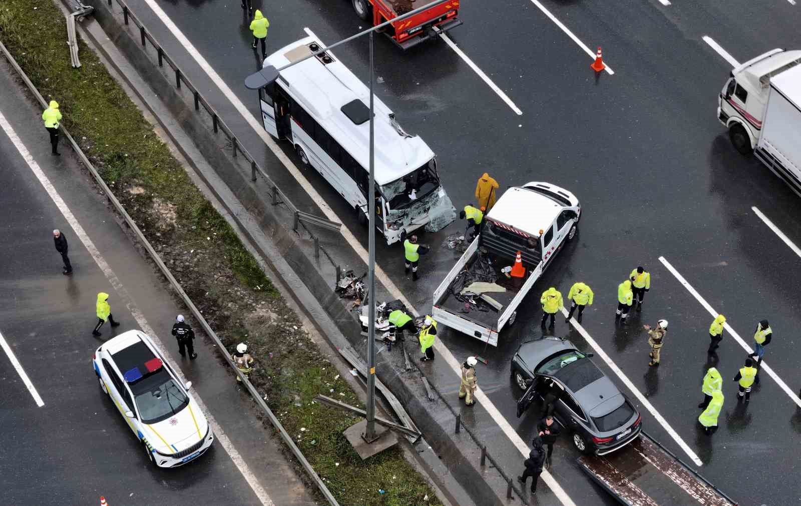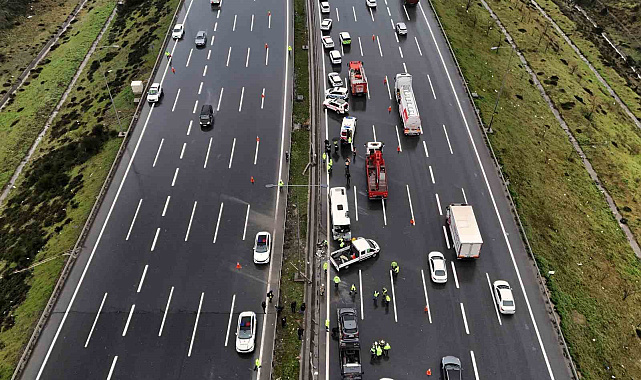 Kuzey Marmara Otoyolu'nda 1 polis memurunun şehit olduğu ve 16 polis memurunun yaralandığı kaza yeri dron ile görüntülendi.Kuzey Marmara Otoyolu Başakşehir - Habipler bağlantı yolunda yağmur nedeniyle kayganlaşan yolda 34 LHU 912 plakalı polisleri taşıyan servis minibüsü ve EYG 499 plakalı otomobil kazaya karışmıştı. Polis minibüsü bariyerlere çarparak dururken, otomobil ise orta refüje uçmuştu. Kazada serviste bulunan 1 polis memuru şehit oldu, 16 polis memuru ise yaralanmıştı. Kaza alanı dron ile görüntülendi. Görüntülerde kazaya karışan araçlar ve ekiplerin çalışması yer alıyor.