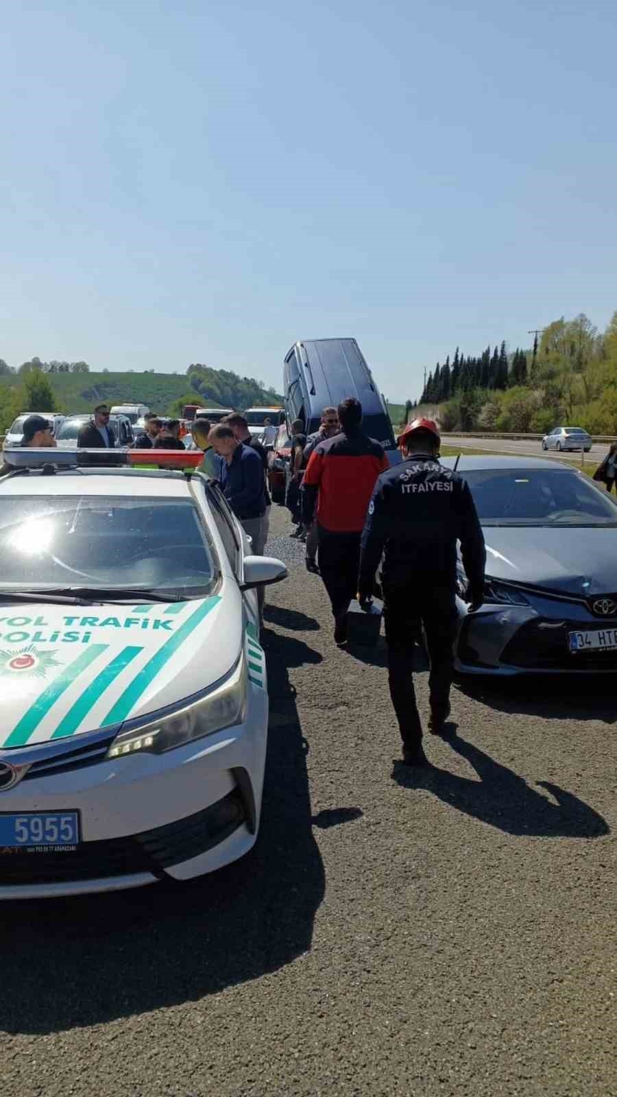 Bayram tatili sebebi ile yoğunluğun yaşandığı Anadolu Otoyolu Sakarya geçişinde meydana gelen 9 araçlı zincirleme trafik kazasında iki kişi yaralandı. İki aracın üst üste çıktığı kazayı görüp şaşkınlığını gizleyemeyenler dönüp bir daha baktı.