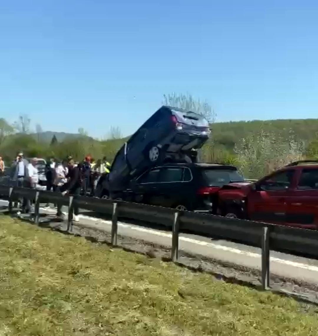 Otoyolda 9 araçlı zincirleme kazada ilginç görüntü: Araçlar üst üste çıktı