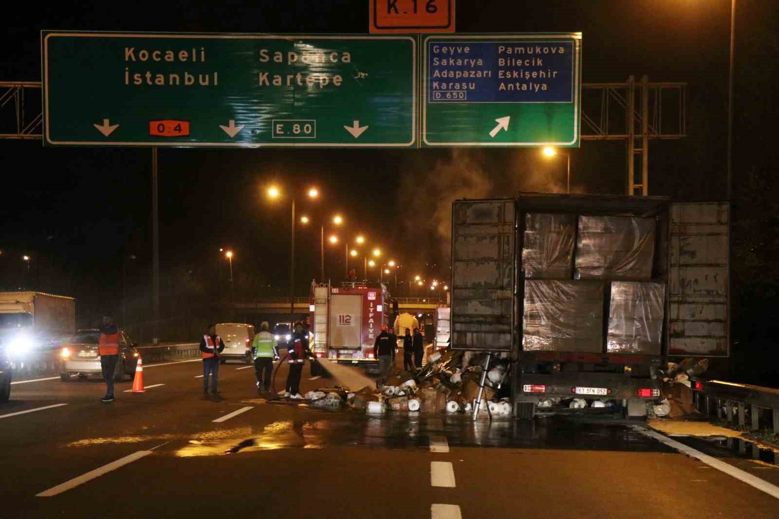 Anadolu Otoyolu Sakarya geçişinde elyaf iplik yüklü tırda yangın çıktı. Tırın çekicisinin tamamen yanarak hurdaya döndüğü yangında, dorse kısmında bulunan malzemelerin birçoğu yanarak kullanılamaz hale geldi.