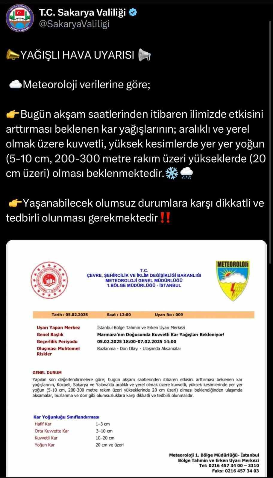 Sakarya Valiliği, şehir genelinde akşam saatlerinde etkisini artırması beklenen kar yağışı sebebiyle uyarılarda bulundu.
