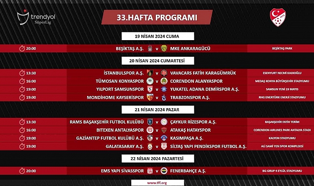 Trendyol Süper Lig'in 33. haftasında oynanacak maçların fikstürü belli oldu.Türkiye Futbol Federasyonu, resmi internet sitesinden yaptığı açıklamada, Trendyol Süper Lig'in 33. haftasının programını duyurdu.Süper Lig'de 33. hafta programı şöyle:19 Nisan Cuma20.00 Beşiktaş - MKE Ankaragücü20 Nisan Cumartesi13.30 İstanbulspor - Fatih Karagümrük16.00 Konyaspor - Corendon Alanyaspor19.00 Samsunspor - Adana Demirspor19.00 Kayserispor - Trabzonspor21 Nisan Pazar13.30 RAMS Başakşehir - Çaykur Rizespor16.00 Antalyaspor - Hatayaspor19.00 Gaziantep FK - Kasımpaşa19.00 Galatasaray - Pendikspor22 Nisan Pazartesi20.00 Sivasspor - Fenerbahçe