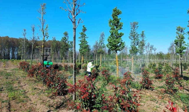 Kocaeli Büyükşehir Belediyesi tarafından, üretim fidanlığında yetiştirilen bitkilerin sağlıklı gelişimini desteklemek amacıyla zararlı böceklere karşı koruyucu ilaçlama çalışması yürütülüyor.